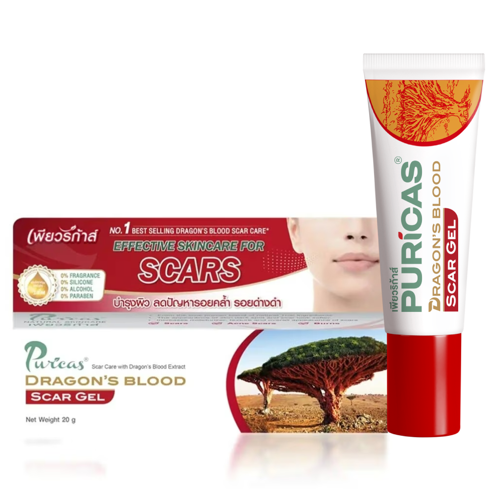 Puricas Dragon's Blood Scar Gel ยังช่วยต้านการอักเสบ สมานแผล เชื่อมต่อผิว และทําให้ แผลหายเร็วยิ่งขึ้นโดยการทํางานควบคู่กับ Allium Cepa เพื่อลดรอยแผลเป็นและช่วยลดเลือนจุดด่างดําจะเห็นผลได้ดี กับแผลเป็นที่เพิ่งเกิด หรือแผล/รอยจากสิว